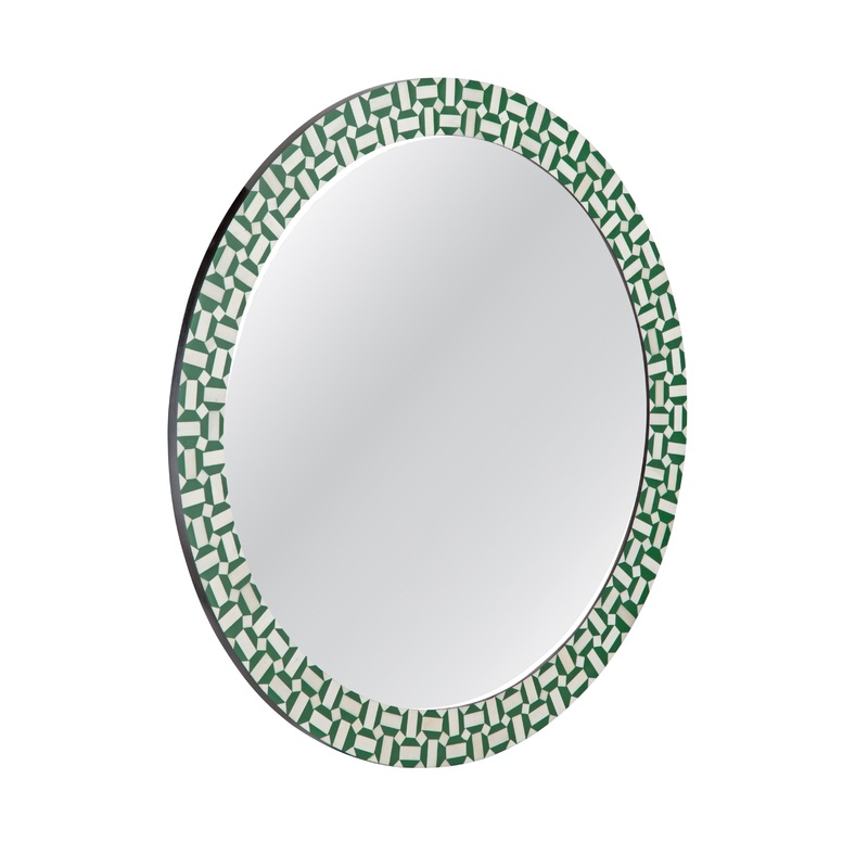 The Alanis Wall Mirror showcases a chic round design, accented with an eye-catching geometric pattern in a vibrant green finish. Its boho-modern aesthetic adds a trendy flair to any space, while the green and cream bone inlay creates a striking contrast fo