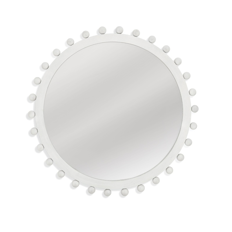 The Allard Wall Mirror showcases a whimsical design with its round frame adorned with wooden spheres, adding a playful and charming touch to any room. This unique feature brings character and personality to your space, making it a delightful addition to any space.