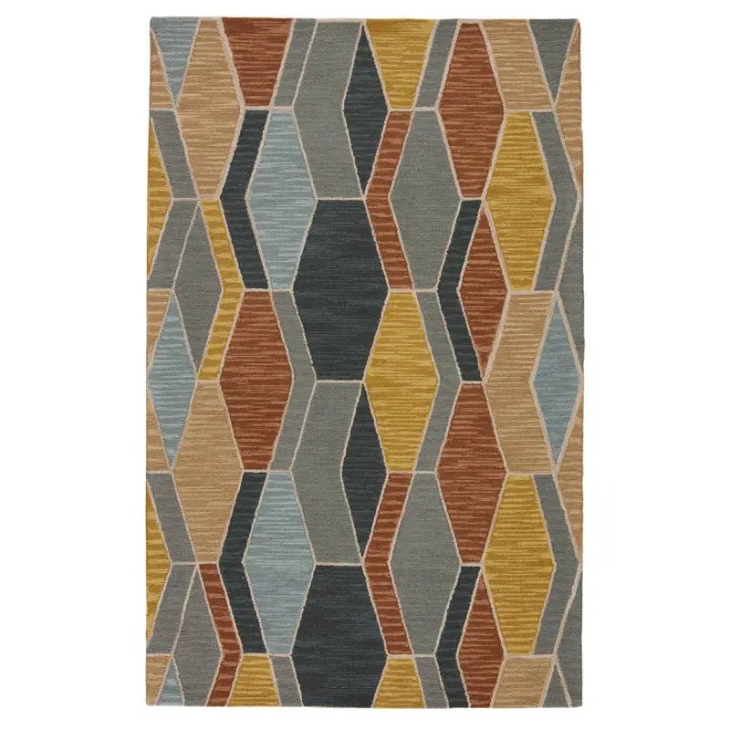 The Amado collection delivers a striking, ultra-modern aesthetic with bold geometric patterns and rich, earthy tones. Featuring a dynamic blend of slate, brown, and ochre, the Sade rug makes a retro-inspired statement with its hand-tufted wool construction. The cushioned looped pile adds luxurious softness underfoot, making it a perfect blend of style and comfort for contemporary spaces.