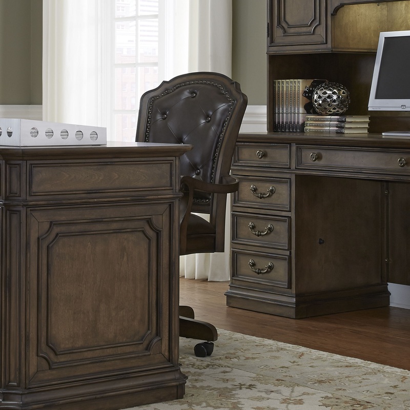 Sit in comfort and style while working from home or the office with the Amelia Jr executive office chair. Crafted of poplar solids, this piece features a timeless antique toffee finish, tufted brown vinyl upholstery with a nail head trim, adjustable height, and casters for easy maneuvering. Amelia offers traditional styling that takes elements of the past and makes them relevant today.
