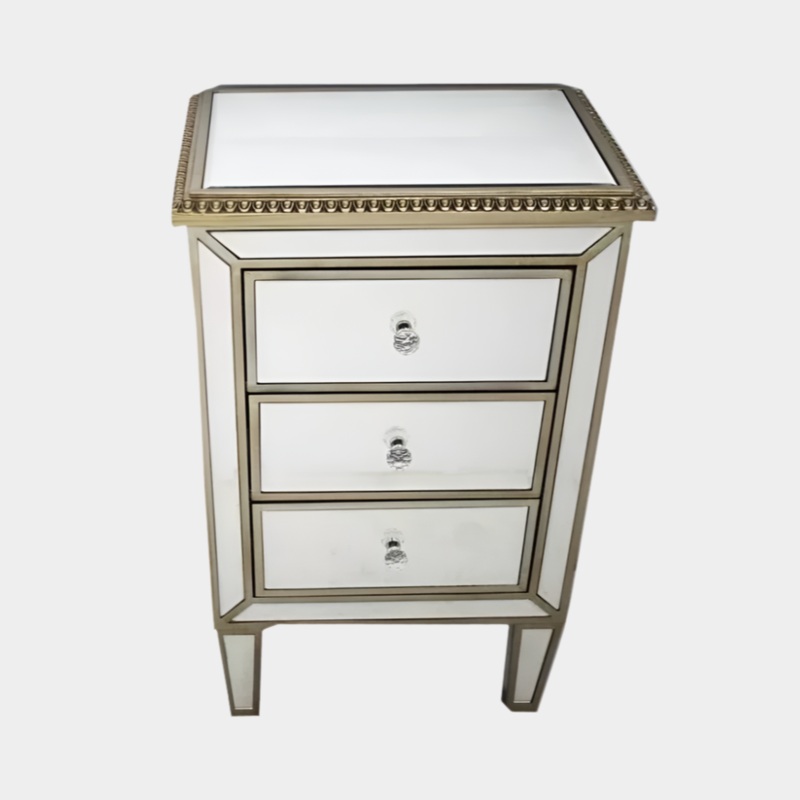 Mirrored finish nightstand with crystal clear knobs for the triple drawers.