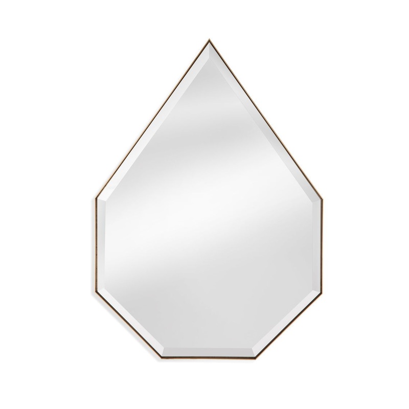 The Arlington Wall mirror features a dramatic faceted teardrop share and a understated metal frame with gold finish.