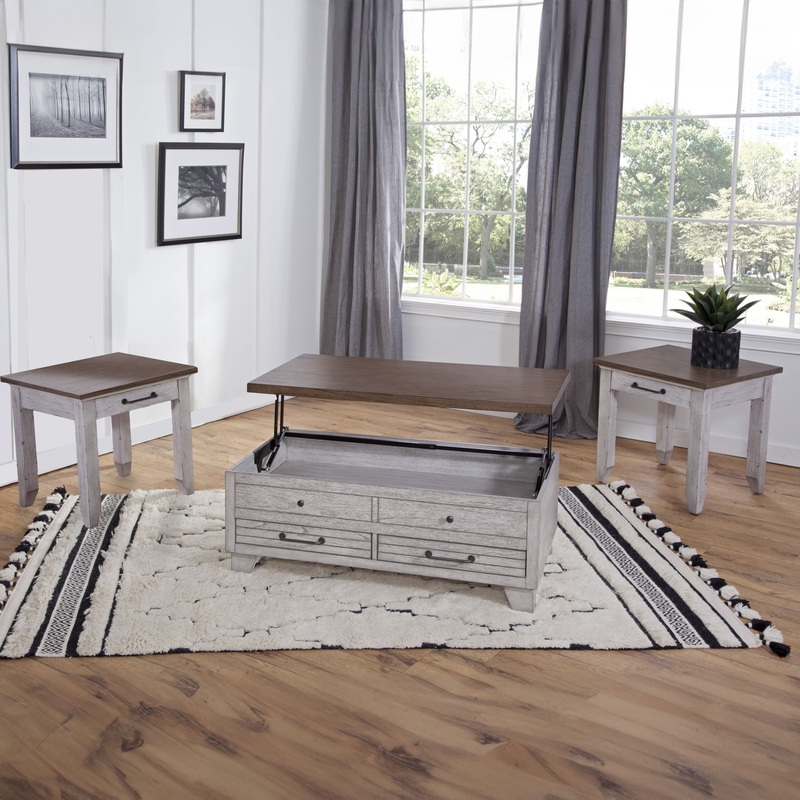 Add some function to your living room with the Lift-Top Cocktail Set from Bear Creek! Perfect for your farmhouse-inspired home, the Bear Creek Lift-Top Cocktail Table adds needed functionality to your life by giving you a work surface right on your sofa. Just lift-up the top of the Bear Creek and work or eat right from your sofa. The casual two-tone combination of white and honey smoke finish works well with any casual upholstery setting and features distressing that make the tables look like a vintage heirloom in any room.