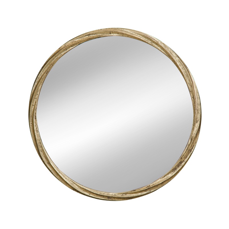 The Beekmann Hill wall mirror is round with a gold twisted frame. The frame is finished in a gold leaf and encircles the clear glass mirror.