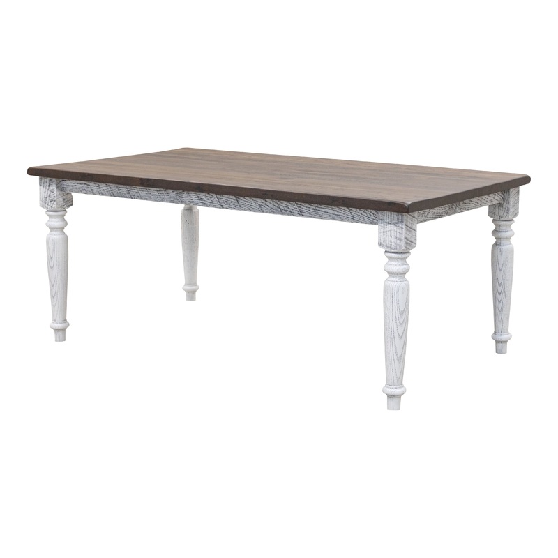 The Belmont Dining Table is built out of rustic, reclaimed wood and features a turned leg style base and a solid top without leaves. This table is also available with self-storing leaves upon request, which makes the planks to run widthwise. Contact us here at to order a table in your choice of color and size.