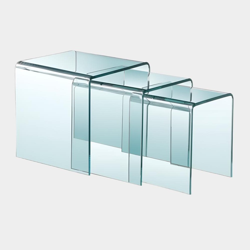 Set of 3 bent glass nesting tables with 12 mm glass thicknessA great addition to any living roomDimensions:60 x 50 x 45 cm23.6 x 19.7 x 17.7 inches50 x 50 x 42 cm19.7 x 19.7 x 16.5 inches40 x 50 x 39 cm15.7 x 19.7 x 15.4 inches