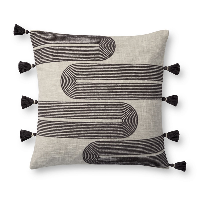 Modern and playful, this black-and-white throw pillow from Brigette Romanek x Loloi features embroidered arch designs trimmed with tassels. The front pillow cover is made of 100% cotton and measures 22 x 22, a standard size to style in living rooms and bed