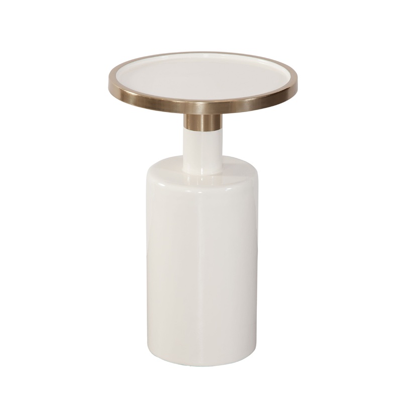Meet the Brice Accent Table, a contemporary statement piece in elegant white. Crafted from iron with a sleek painted white finish and chrome accents, this table boasts a clean, glossy look. Its circular shape and the unique chrome finish at the table's edg