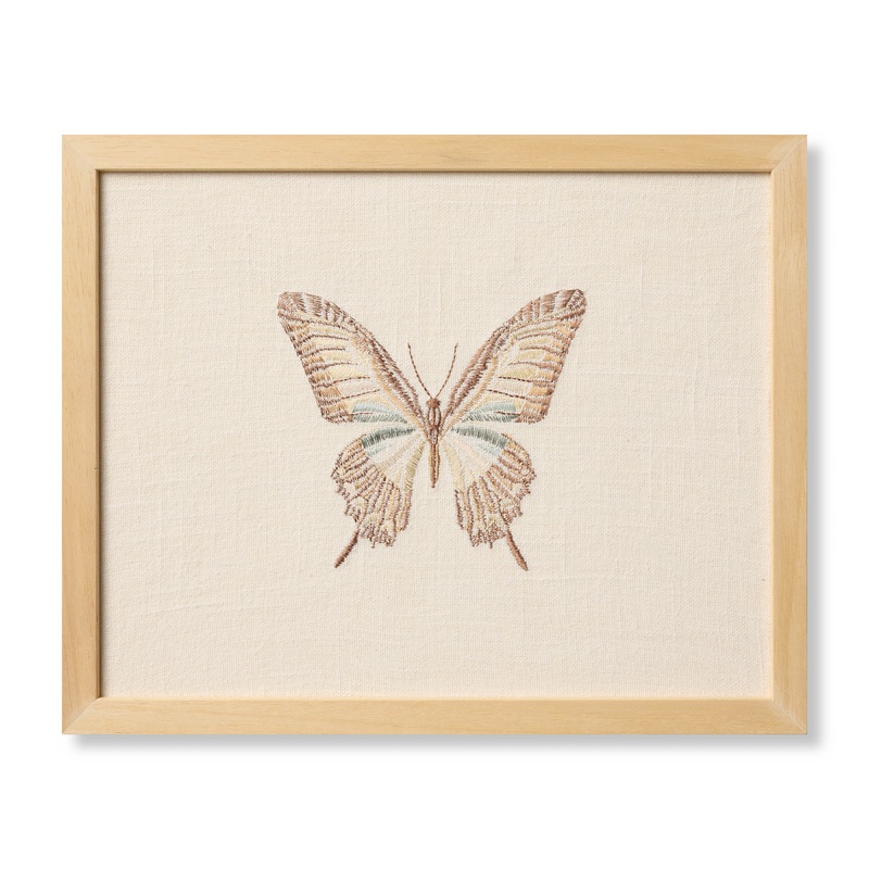 Butterfly wall art features a delicately minimal embroidered beige butterfly, a beautiful accent piece for many home decor styles, from farmhouse to traditional. The artwork is made in India of cotton and custom framed by Loloi in the USA, measuring 15 x 12.