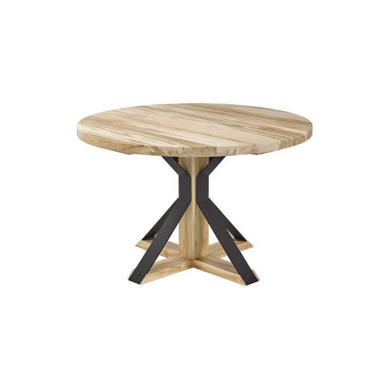 The Cardinal Woodcraft Hyde Dining Table makes a lasting impression with a unique use of mixed materials. The Hyde table's single pedestal base pairs solid wood with metal accents for a dash of industrial edge. This dining table can be customized to your d