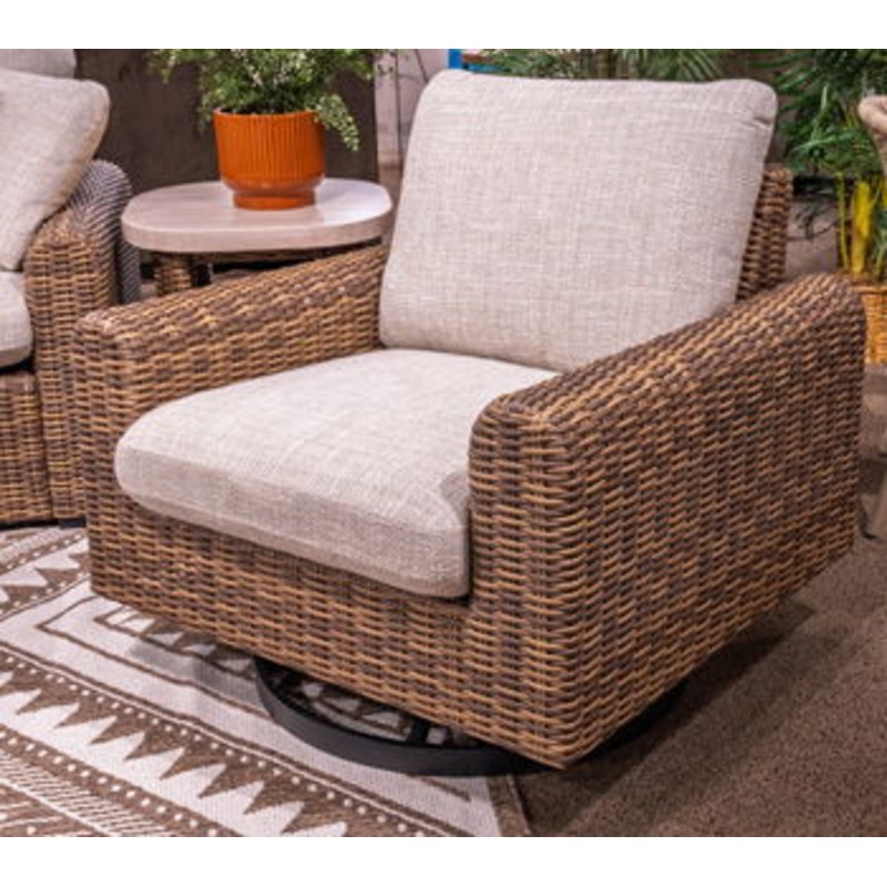 Get back to nature with the relaxed styling of the Angel Island outdoor swivel lounge chair. Crafted with a sturdy aluminum frame and resin wicker, this piece offers exceptional durability and style. Plush cushions covered in high-performance Nuvella fabric are as resilient as they are attractive. Sounds like fabulous form and function to us.