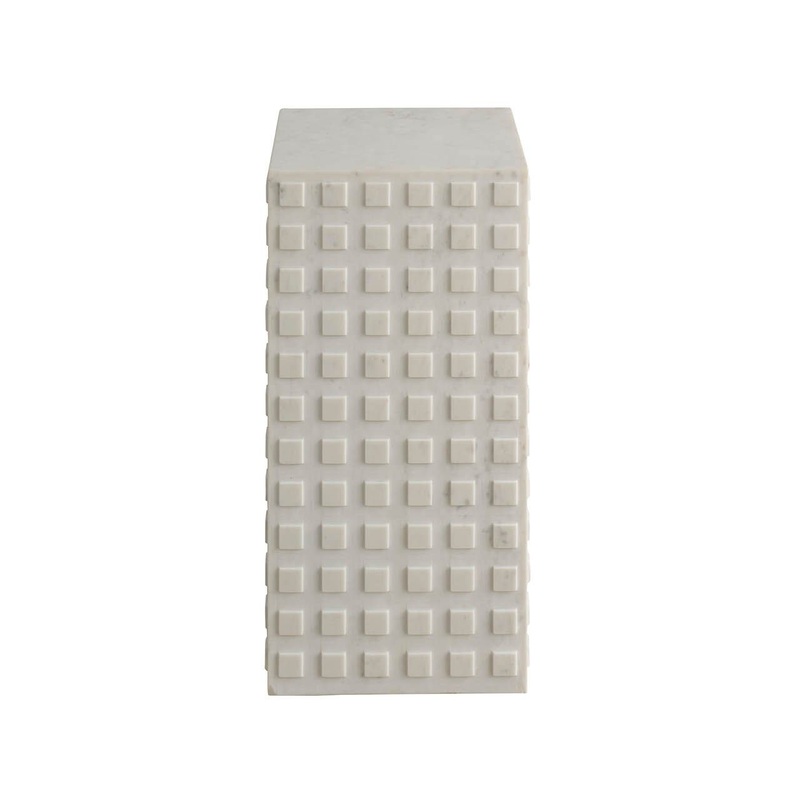 The Dwell Stone Accent Table brings a touch of architectural intrigue to your space. Crafted from solid stone, its cubic form features a textured, grid-like surface, adding a tactile and visually compelling element. This piece serves as a striking accent, functioning as a side table, pedestal, or sculptural object. Its natural stone finish and unique design make it a focal point in any contemporary setting.