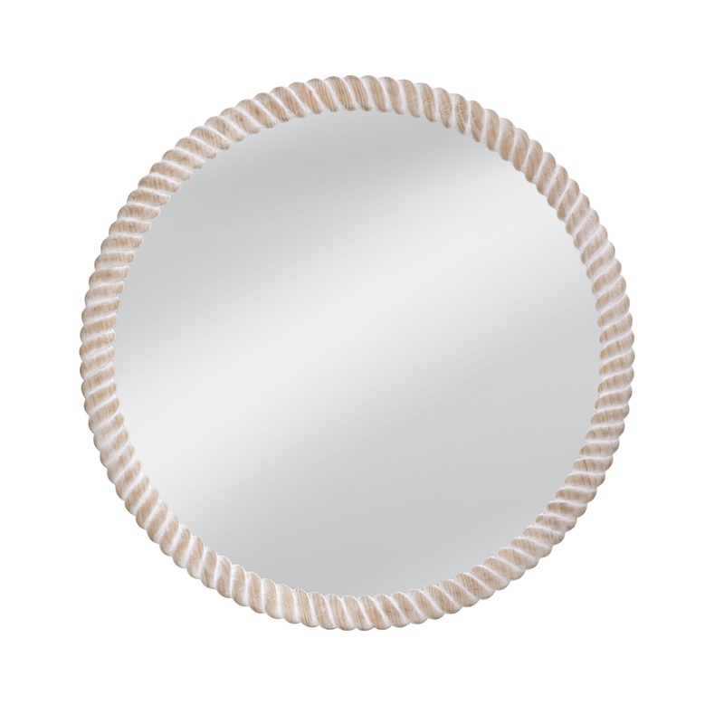 The Ely Wall Mirror boasts a charming round frame adorned with a rustic rope motif, creating a warm and inviting focal point for any room. Finished in a weathered white tone, it exudes timeless elegance while adding a touch of coastal charm to your living