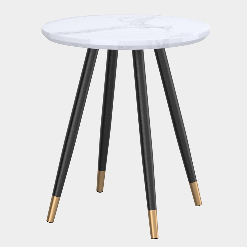Bring a designer touch to your space with the Emery Round Accent Table. Featuring a white faux marble top and black A-line metal legs with aged gold accents, this contemporary piece elevates any room. Perfect as a bedside table, hallway accent, or paired with coordinating living room pieces.