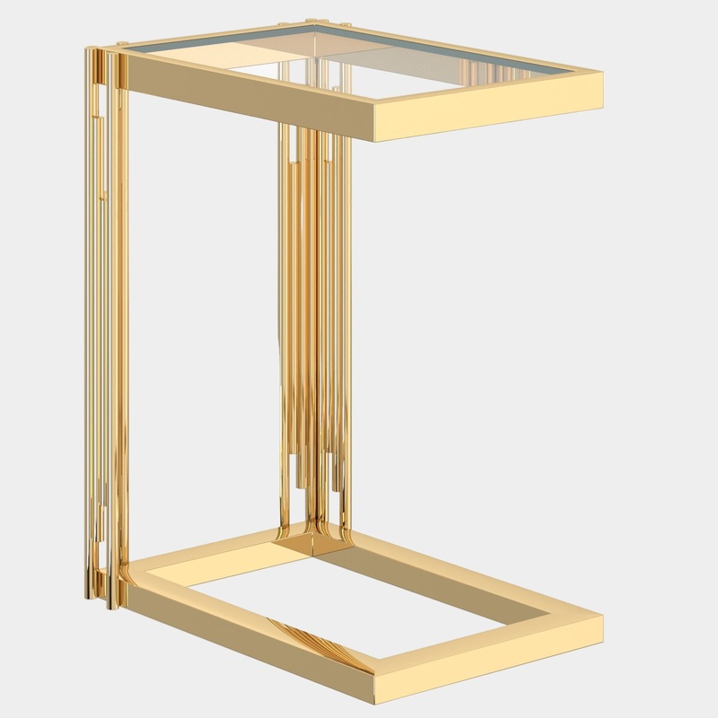 Add art-deco charm to your living space with the Estrel Small Accent Table. Its polished gold metal frame and clear glass top bring instant shine, while the open c-style design makes it perfect to pull up next to a sofa or chair ideal for holding drinks or