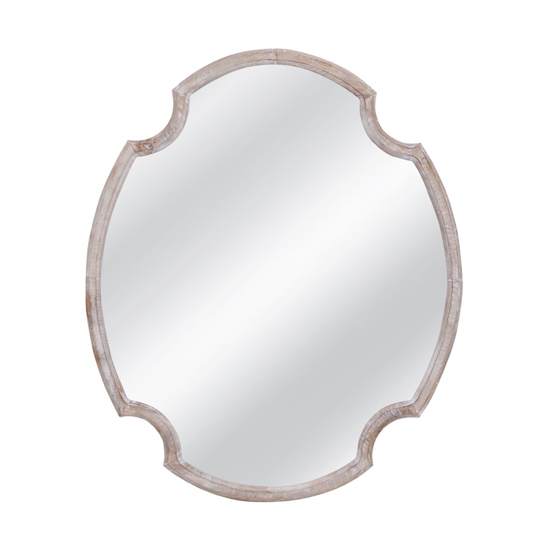 The Fairvale Wall Mirror features a French country aesthetic with a white-washed wood frame, bringing a rustic yet refined touch to any space. The oval shape, complemented by soft indentations in the frame, adds a unique, vintage-inspired appeal. This mirr