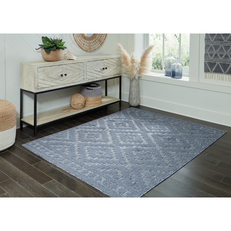 sku : R405682InformationBlend in while standing out with the energetic feel of this rug. Bringing shades of blue together in a diamond design, this decidedly contemporary piece has the versatility to wow in both indoor and outdoor spaces.FeaturesMade of po