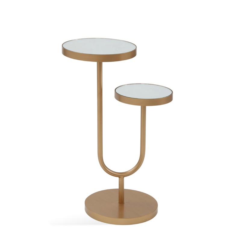 The High-Low Scatter Table boasts modern contemporary styling. The table features two staggered, mirror table tops that are perfect for holding drinks and snacks. The gold metal stand features curved tubed support on a large circular base.Product FeaturesT