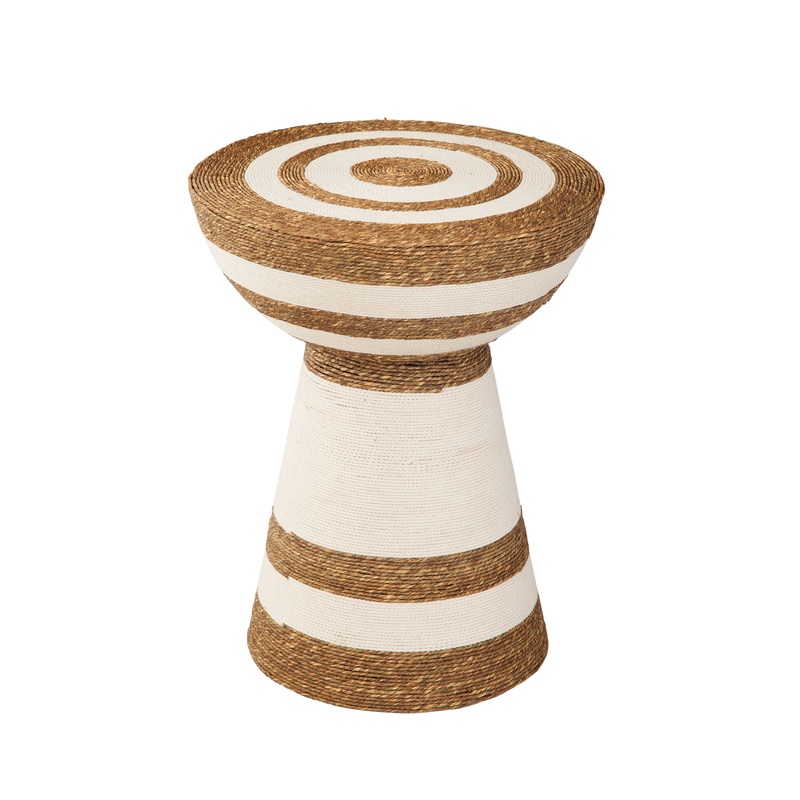 Introducing the Jayce Accent Table, a bohemian-inspired piece featuring calming tan tones. Crafted from iron and jute, it boasts a natural and contrasting finish, adorned with tan and white horizontal stripes, adding a touch of playful charm. This circular