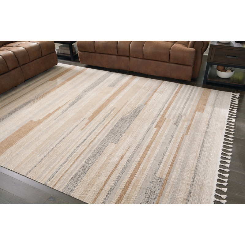 sku : R405891InformationLinear imagery and neutral hues in this area rug evoke a casual-chic vibe just perfect for modern, contemporary interiors. Soft comfort underfoot delights the senses and the finished tassel edges add just what you need for a subtle