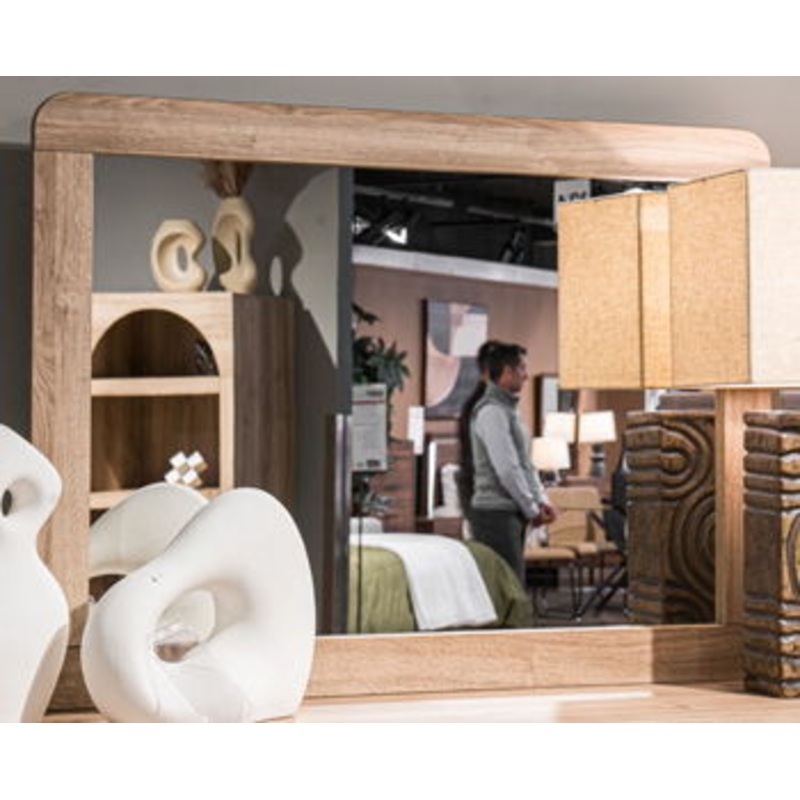 The natural wood tones and clean lines of this bedroom mirror echo your easygoing style sensibilities. With a warm finish and replicated oak grain, its carefree character lightens up your bedroom. Its a chic and functional addition to the matching dresser
