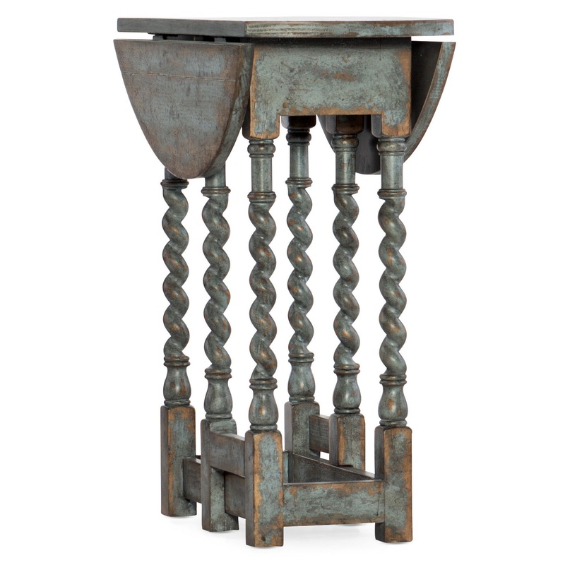 With chic curvy legs and a chunky base, the Prause Gate Leg Table is reminiscent of European antiques brought to this country by immigrants during the time of America’s westward expansion. This character-filled piece is also practical. Put the drop leaves down for a snug fit next to the sofa, but raise them up to use this piece for an extra table top or serving surface. Finished in the dreamy Blue Bonnet, a soft blue accent finish with a rubbed patina and distressing. Taking the next step in creating a Hill Country family of collections, Hooker Furniture has introduced LaGrange. The anthology of bedroom, living room, dining room, occasional and home office furniture is inspired by the Hill Country region of Texas, including the town of LaGrange, one of the stops made by the Hooker Furniture design team in search of inspiration. The collection includes heavily distressed oak and hickory surfaces, extensive carving and scroll work, aged metals, sedimentary stone and primitive textiles. Each piece has a unique story to tell, while still retaining the authentic American character of the original collection. LaGrange is updated with a fresh new personality, brought to life by four distinctive finishes and modern conveniences for the lifestyles of today.
