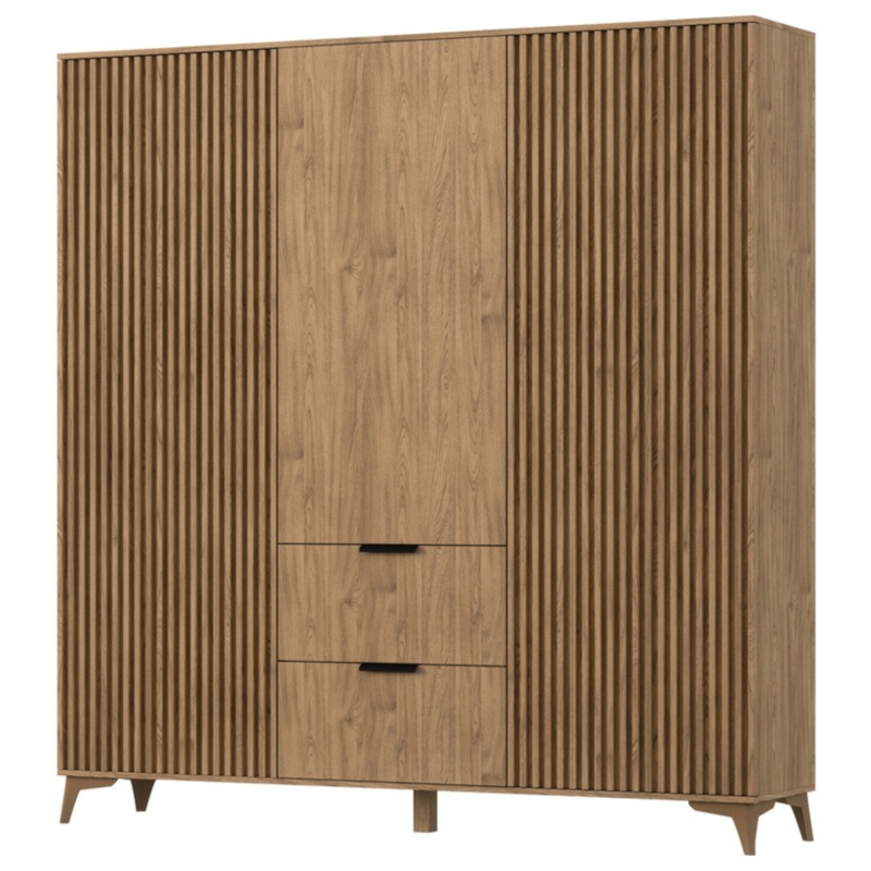 Trsdurvju skapis no LANA kolekcijas ir idels risinjums tiem, kas novrt klasisk boho stila apvienojumu ar modernm dekoratvm lstm, kas pieir interjeram uniklu raksturu. T elegant ozolkoka apdare pieir armu, dabisku siltumu un harmonizjas ar dadiem aranjumiem. is drbju skapis nodroina daudz vietas uzglabanai. Divas atvilktnes auj rti sakrtot aprbu, apakveu un citus priekmetus. Iekpus ir plaukti un divi stiei, kas atvieglo drbju iroanu un pakarinanu. Izgatavots no augstas kvalittes 16 mm biezas lamintas pltnes, garant izturbu un noturbu ikdienas lietoanai. ABS malas nodroina efektvu aizsardzbu pret mehniskiem bojjumiem, aizsargjot korpusa malas un nodroinot t ilgstou izturbu. Skapim ir melni rokturi, kas ne tikai pieir eleganci, bet ar atvieglo atvilktu atvranu un aizvranu. Kjas nodroina stabilitti un auj viegli notrt grdu zem drbju skapja.