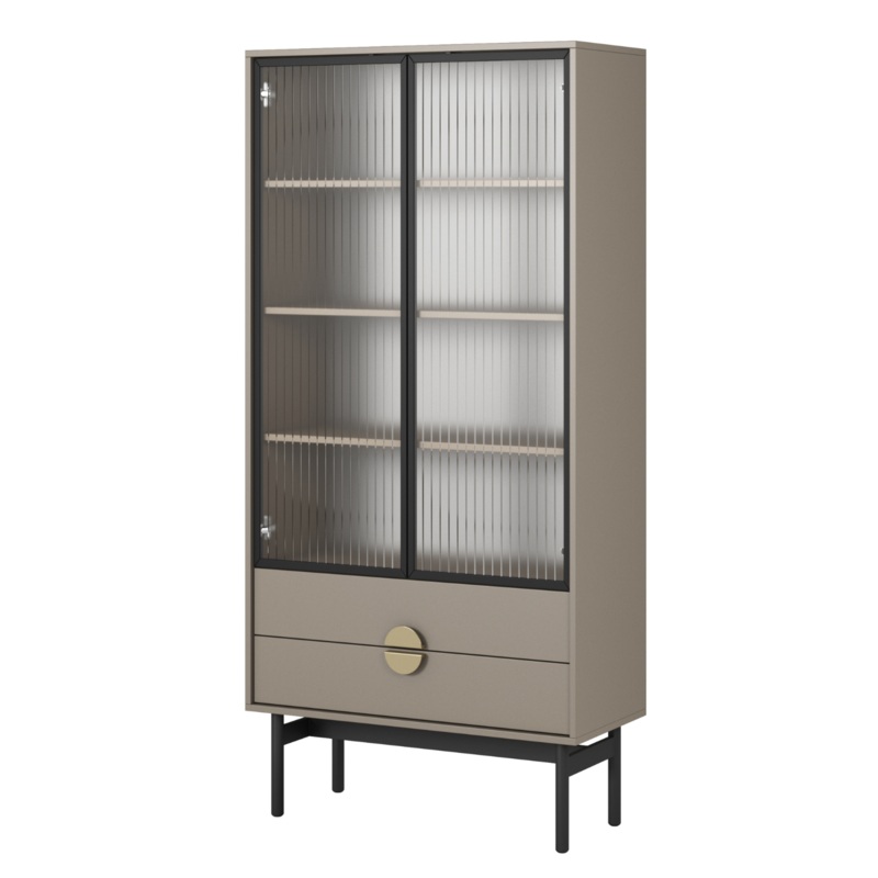 LOON vitrna ar uniklu dizainu elegant krs labi iedersies modern interjer. T ir izgatavota no augstas kvalittes lamintas skaidu pltnes, kas nodroins ilgu un nevainojamu lietoanu. Ts raksturu paspilgtina masvais rmis no melna trauda, kas ne tikai pieir mbelei izturbu, bet ar pieir tai industrilu armu. Savukrt zelta rokturi, kas veido apli, ir ne tikai praktisks elements, kas atvieglo atvranu, bet ar pieir eleganci un smalku armu visam skaptim. neliel, bet izsmalcint detaa izce mbeles, pieirot tm nedaudz greznuma. Skaptis ir veidots, domjot par funkcionalitti, tpc taj ir atvilktnes mazkiem priekmetiem un aizsldzama daa ar plauktiem dekorcijm, imenes piemim vai mini bibliotkai. Vl viena priekrocba ir stikla priekpuse, kas izgatavota no rievota dekoratv stikla, kas pieir vieglumu un eleganci. Neparasts krsas sasple ar melno rmi un zelta rokturiem veido harmonisku un modernu veselumu, kas lieliski iedersies dados interjera dizainos, pieirot tiem uniklu raksturu. mbele ir ne tikai praktisks uzglabanas risinjums, bet ar dizaina elements, kas izdaios un izcels jebkuras telpas individulo stilu.