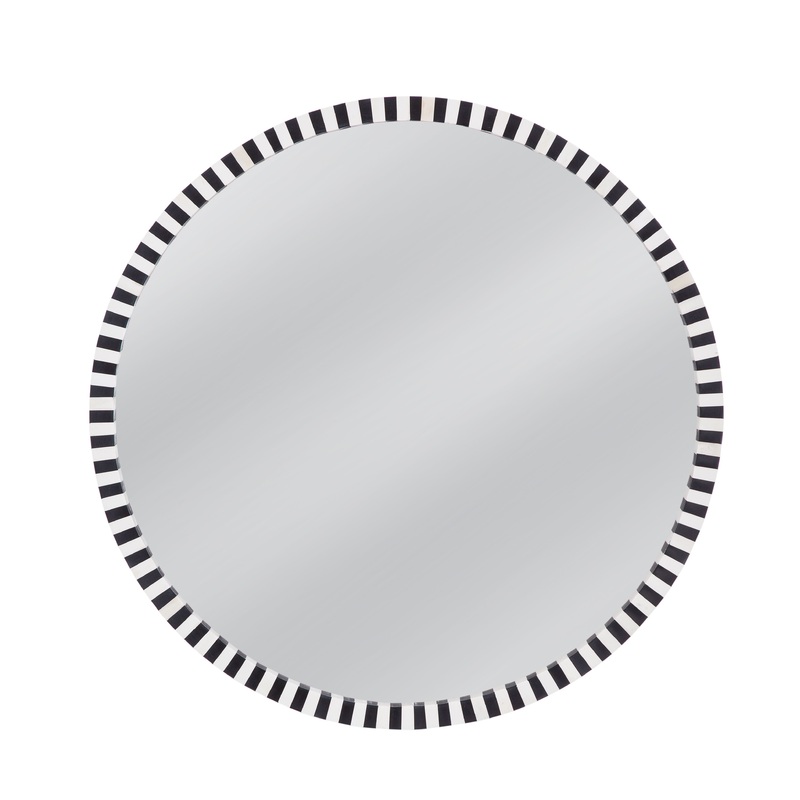 The MacArdle Wall Mirror boasts a charming round design adorned with an intricate geometric pattern, beautifully finished in black and cream. This modern boho piece adds character to any space, effortlessly blending contemporary aesthetics with artisanal f