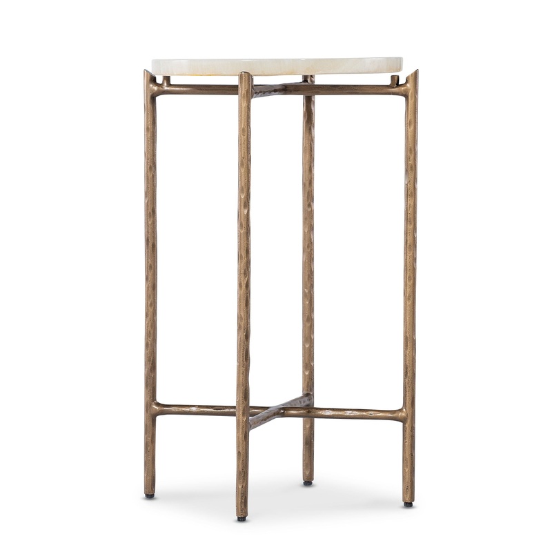 Add a touch of elegance to your living room with the Je Suis Petit Spot Table from the Melange collection. This round accent table features a textured gold metal frame paired with a luxurious onyx stone top, creating a sophisticated and timeless design. Perfect as a side table or decorative accent, its compact size makes it a versatile addition to any space.