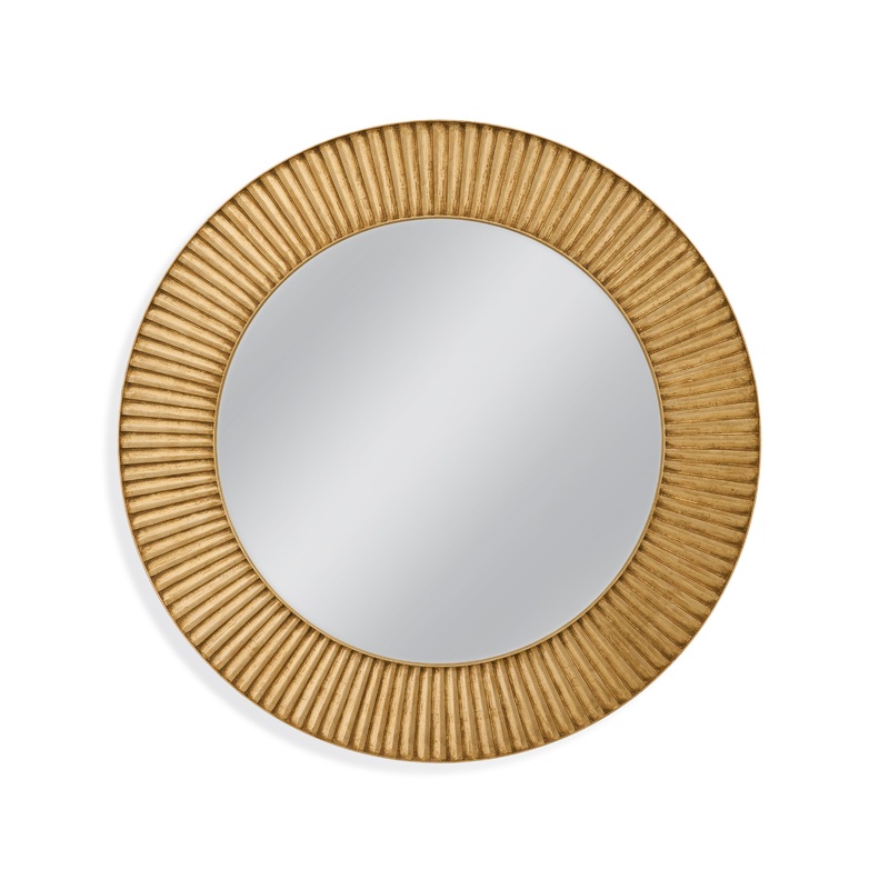 Midtown Wall Mirror is round with a 6″ gold sunburst like frame.