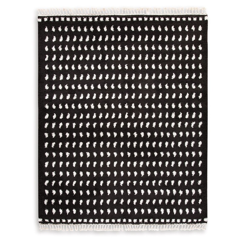 Sink your feet into this modern area rug. Offering a luxurious shag with a woven dot design in black and white, it adds sophistication without sacrificing comfort or durability. A braided tassel edge completes the design of this family-friendly accent rug.