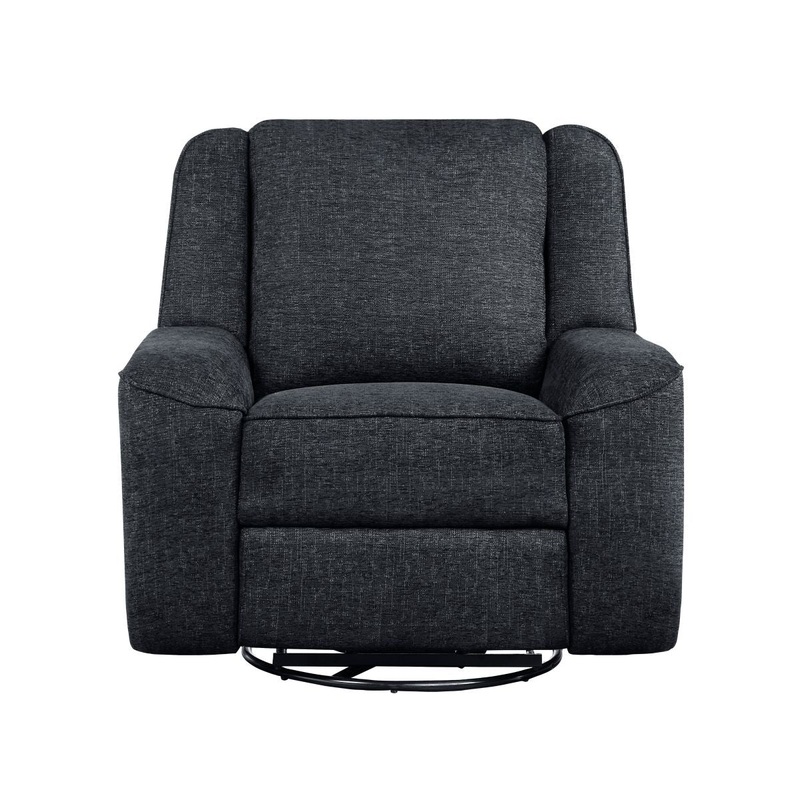 The Monterey Collection presents a modern seating arrangement for your homes living room, its streamlined profile and dark hue canvas for your decorative styling, and its comfort a respite from the hustle and bustle of daily life. The swivel chair features a manually engaged reclining function, offering a maximized opportunity to stretch out. Ebony-hued chenille fabric upholstery covers the chair.
