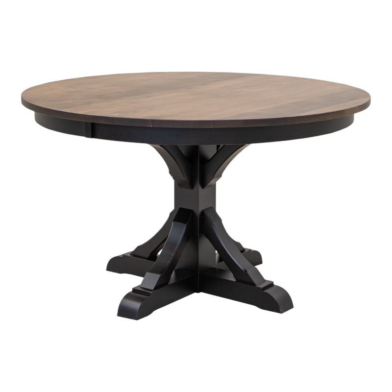 features the Newport Round Extending Dining Table with a 1″ thick solid hardwood top. This Amish-made table is designed to last and features a convenient extending mechanism that allows you to add an optional leaf for extra seating space.