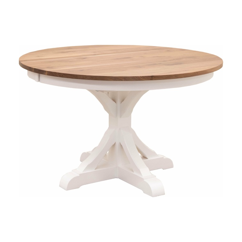 features the Newport Round Extending Dining Table with a 1″ thick solid hardwood top. This Amish-made table is designed to last and features a convenient extending mechanism that allows you to add an optional leaf for extra seating space.