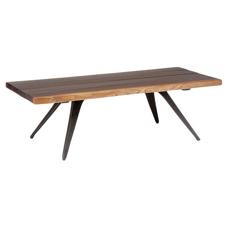 The Vega is a contemporary Coffee Table by Nuevo. The Vega coffee table is a fine example of an increasingly popular movement toward organic modernism, defined by live edge solid French oak with brass dovetail detailing and signature flared cast iron legs. The Vega coffee table embraces the spirit of rustic contemporary design.