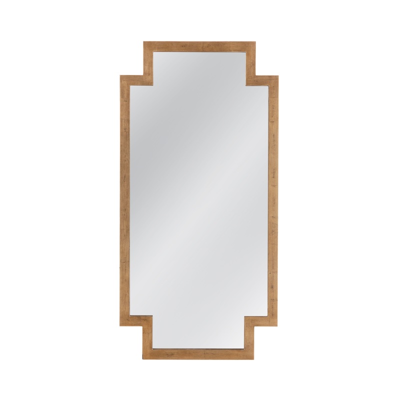 The Oti Wall Mirror boasts a classic rectangular design with cut-out corners, finished in an antique gold leaf for timeless elegance. Its modern aesthetic enhances any space with sophistication and charm. Elevate your decor effortlessly with this stylish and versatile mirror.