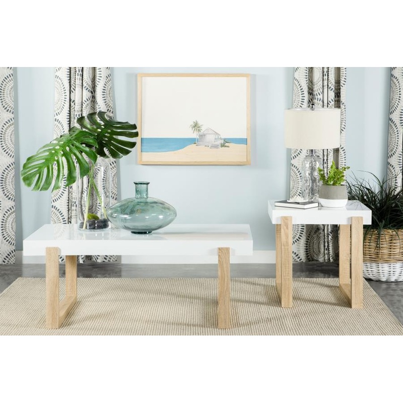 This modern coffee table set combines clean lines and bright hues for a playful yet functional design. Featuring thick high-gloss tabletops, the set includes a rectangular coffee table and a square end table. Each piece rests on a sturdy double U-shaped base in a light natural finish, showcasing variegated wood grain patterns for added charm. Perfect for contemporary spaces, this occasional table set offers versatile surfaces for decor, beverages, or everyday essentials.