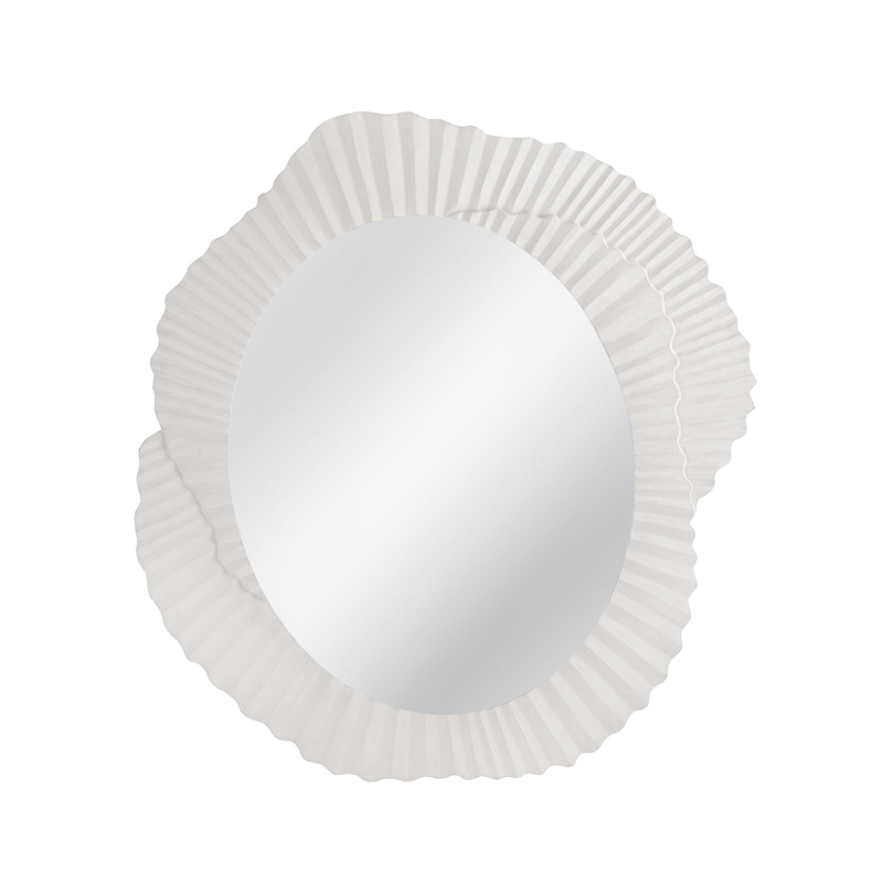 The Petal Wall Mirror showcases a distinctive design, featuring a matte white wood frame that resembles the gentle folds of a flower's petals. The frame's textural details and soft white hue lend a serene and organic feel to the piece, perfectly embodying