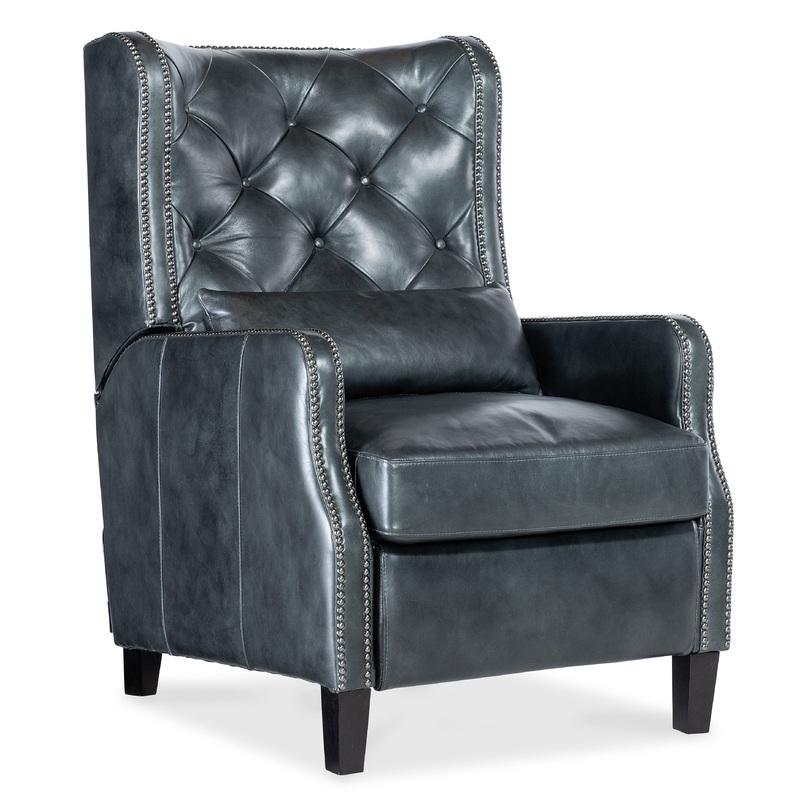 The timeless wing chair is updated with a softer, rounder silhouette and the serene Silver Blue semi-aniline top grain leather cover. The addition of a kidney pillow also adds a new twist. Whittney features a button-tufted back, nailhead trim and square wo
