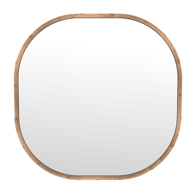 The Richards Wall Mirror boasts a wooden square design with rounded corners, featuring natural materials that evoke a Boho style. Its glass mirror is framed by natural mango wood, with a square frame featuring an inner curve for added dimension and style,