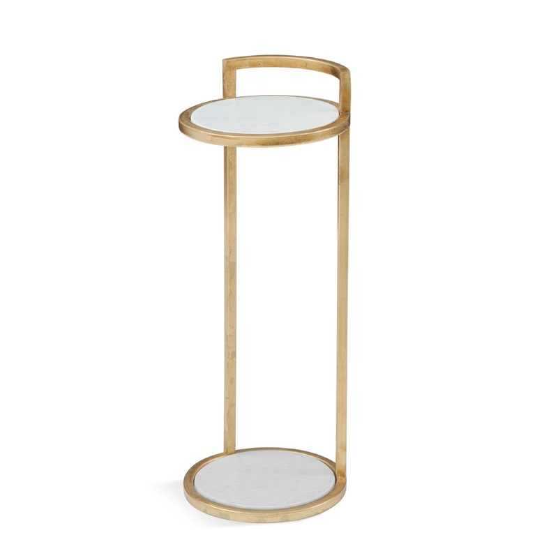 Metro modern styled martini table is perfect chair side accent. Features white marble inserts with gold leaf frame.