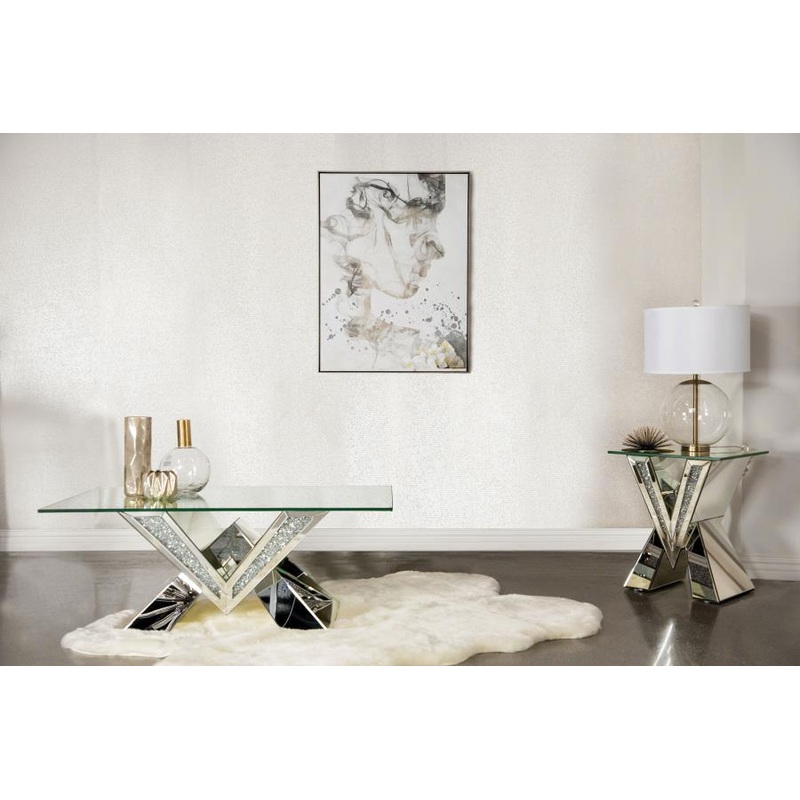 This mirrored coffee table set brings modern luxury to any living space. Featuring a coffee table and matching end table, both pieces boast bold V-shaped bases adorned with mirrored panels and glittering crystal accents. The coffee tables rectangular glass