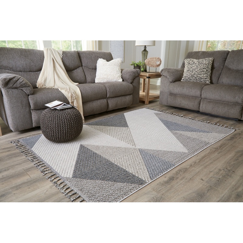sku : R405431InformationThis area rug features a unique appearance with a distinctive geometric design in cream, gray, taupe and blue, with a braided tassel edge for added appeal. This beautiful rug infuses a modern sensibility that simply suits your style
