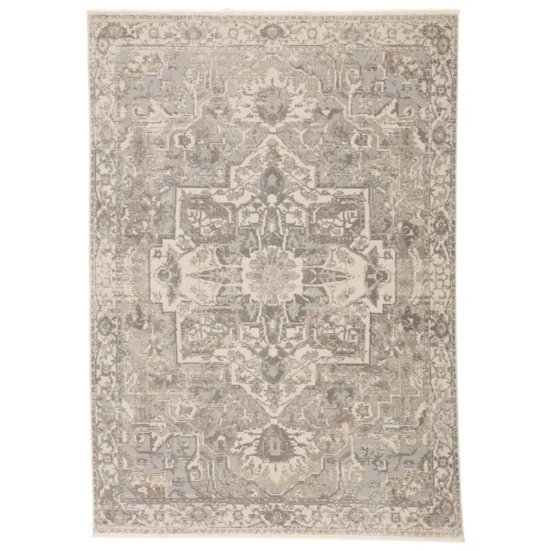 The Vienne collection captures the coveted blanc de blanc aesthetic with vintage-inspired elegance. The Alain rug features a delicately distressed center medallion motif in a sophisticated tonal palette of cream, silver, cool gray, and light taupe. Its lustrous polyester-viscose blend creates a chameleon-like quality that shifts with the light, offering the luxurious appearance of a Turkish hand-knotted rug with the practicality of power-loomed construction. This versatile piece brings timeless character to any space while maintaining accessible elegance.
