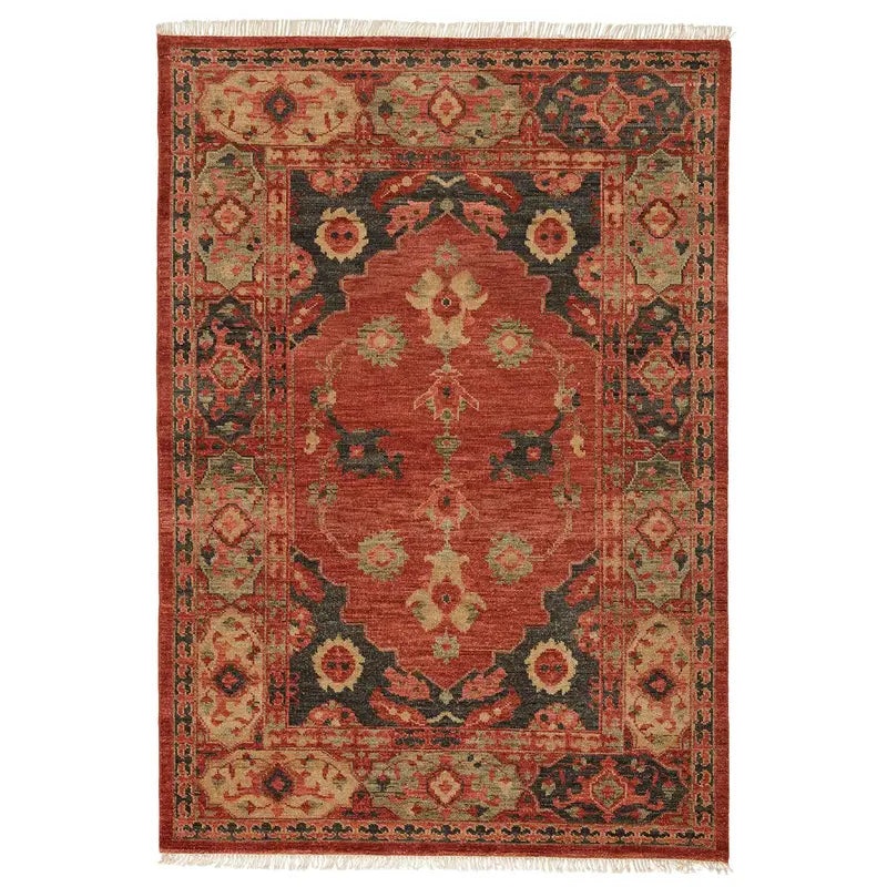 This hand-knotted wool rug reinterprets heritage motifs through a contemporary lens, featuring a bold floral medallion pattern in trending terracotta, black, and green hues. Perfect for anchoring chic living and dining spaces, it creates an instant global-inspired focal point while offering the durability of traditional craftsmanship. The rich color palette and intricate design deliver both visual drama and timeless sophistication.