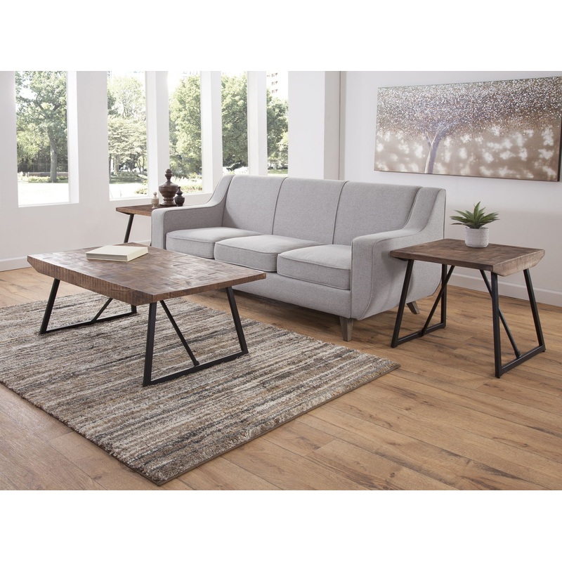The distinctive look of solid mango wood tops in a parquet pattern give this collection its signature look. The natural finish on the tops blend beautifully with the black iron bases molded in a sled type base for a wonderful mixed media design. The transitional yet casual style is relaxed and comfortable with touches of mid-centruy modern design in the canted base with undertop stretchers. Natural looking but stylish, the Walden tables will anchor any room beautifully.