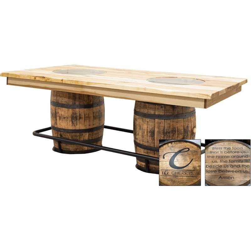 The Double Barrel Barrel Pub Table features a Sawmill or Settler’s distressed plank top on a pair of repurposed whiskey barrels. The look is completed with center glass inserts and black metal foot rail. For more info, contact us at .