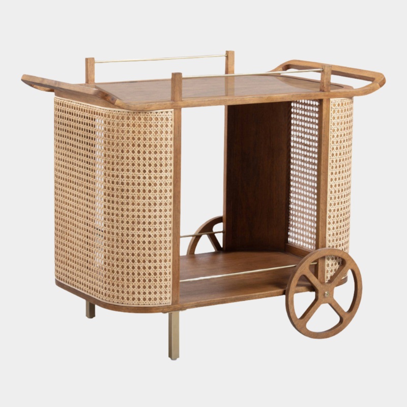 Introducing the Yuma Natural Rattan Bar Cart, a sleek and modern reinterpretation of mid-century charm. This functional piece combines natural rattan cane and solid wood framing, providing both durability and an aesthetic nod to the past. With the added co