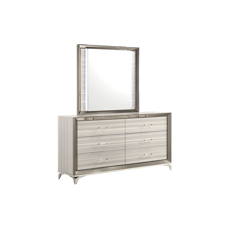 The Zambrano White Collection exudes sophistication and modern charm. Its sleek design, pristine white finish, and polished chrome accents create a luxurious, inviting atmosphere. The spacious storage and built-in LED lights add functionality, making it a perfect blend of style and practicality. A stunning addition to any contemporary bedroom, the Zambrano is a must-have for those seeking both elegance and comfort.